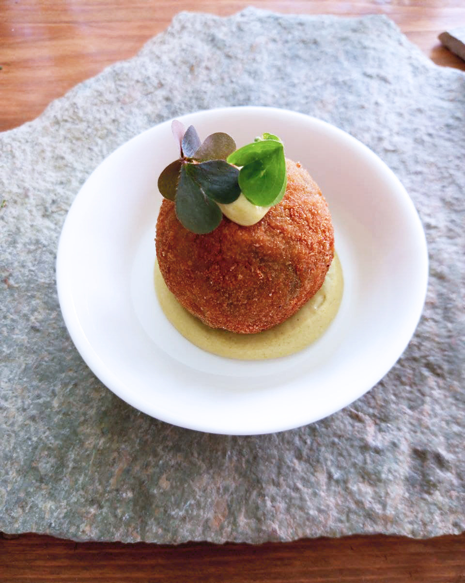 Si è poi proseguito con un arancino/a di risotto alle orle (ovvero spinaci selvatici) con base di crema alle orle e come guarnizione di acetosella, che è un’erba spontanea.