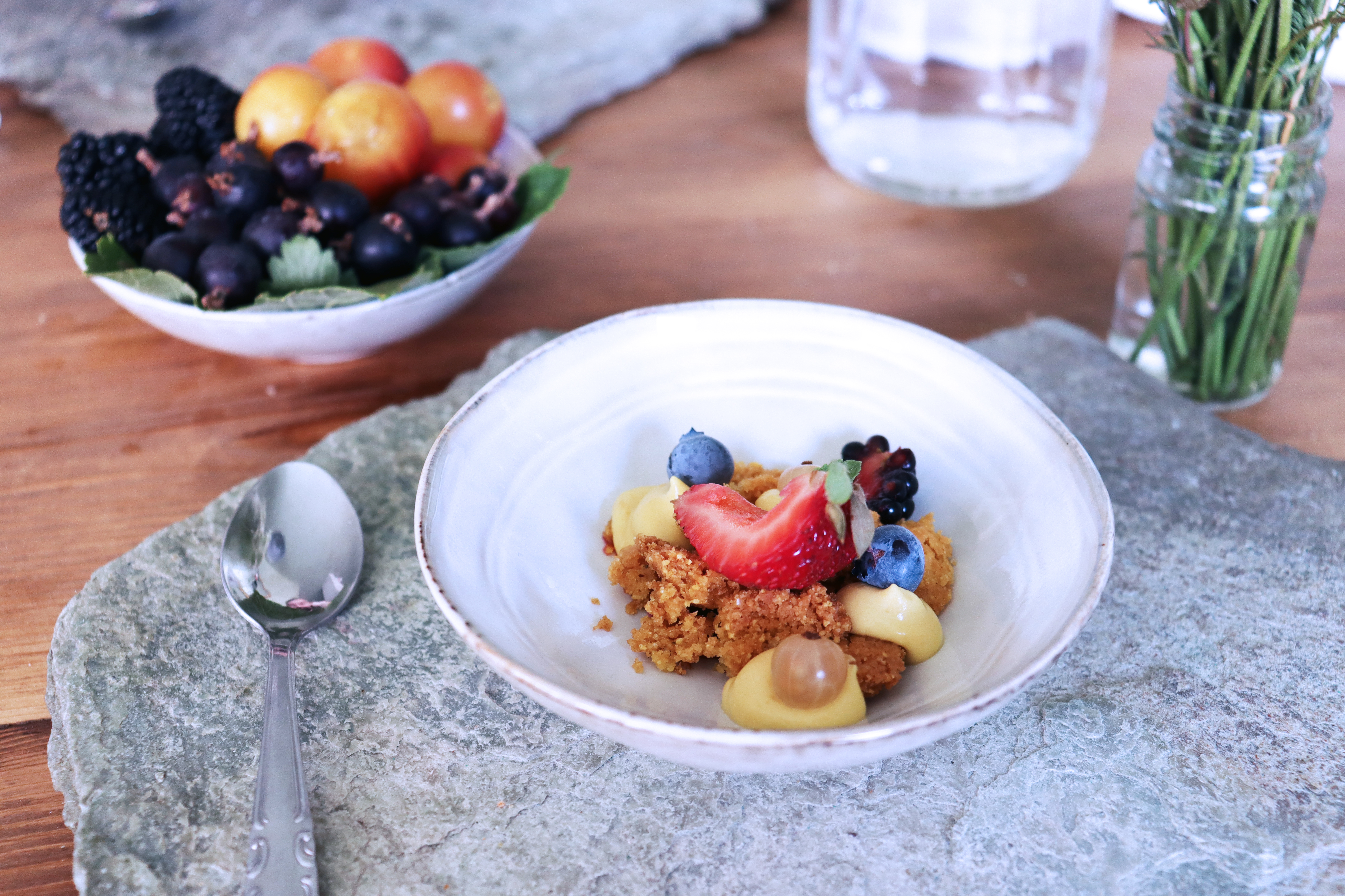 Insolita, ma molto interessante, l’idea di accompagnare il dolce con una piccola scodellina di frutta (direttamente provenienti dai giardini dei genitori dei proprietari).