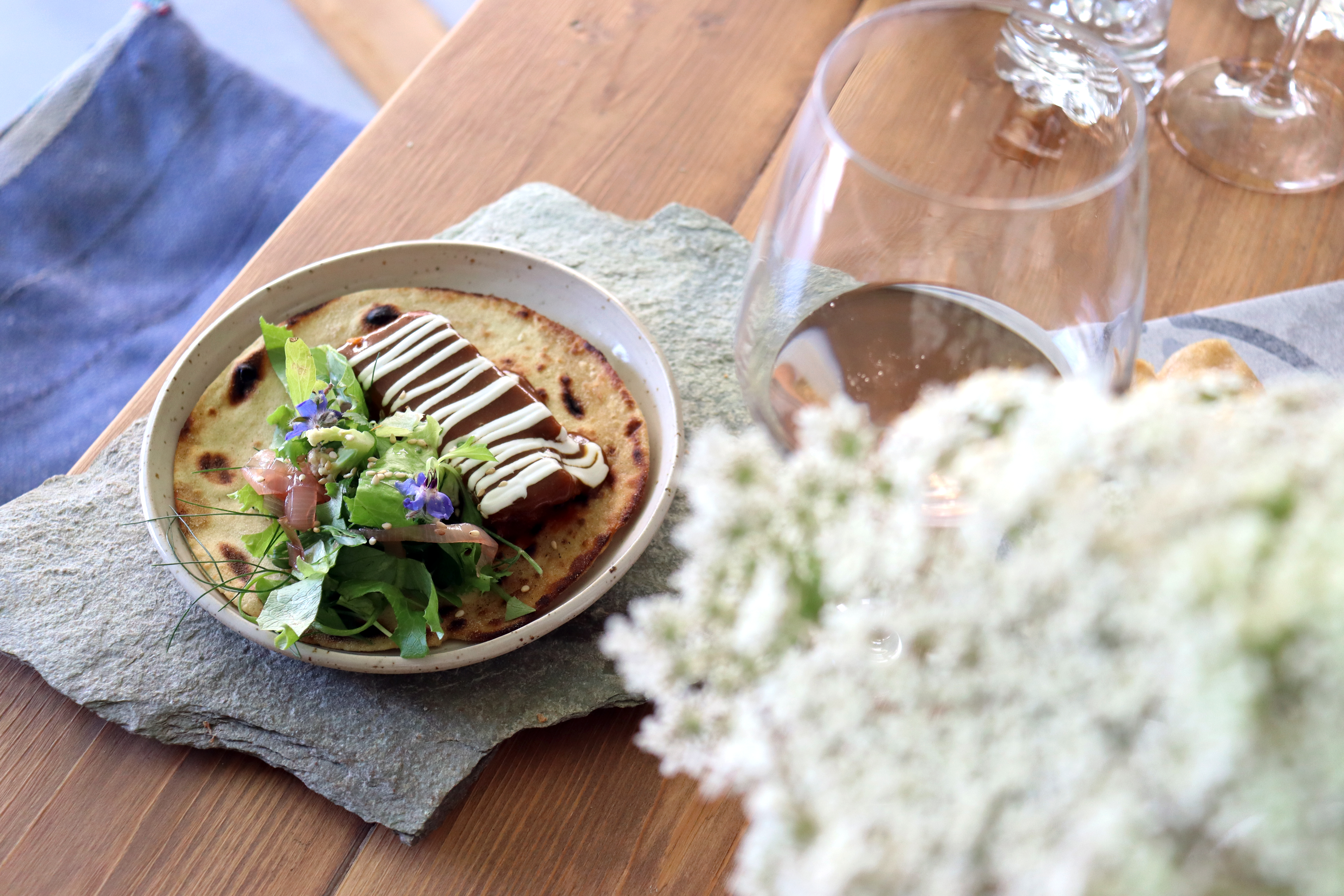 Ultima nota salata: taco composto da loro. Come base troviamo una piadina home made, capocollo di maiale guarnito con yogurt e base di cottura.