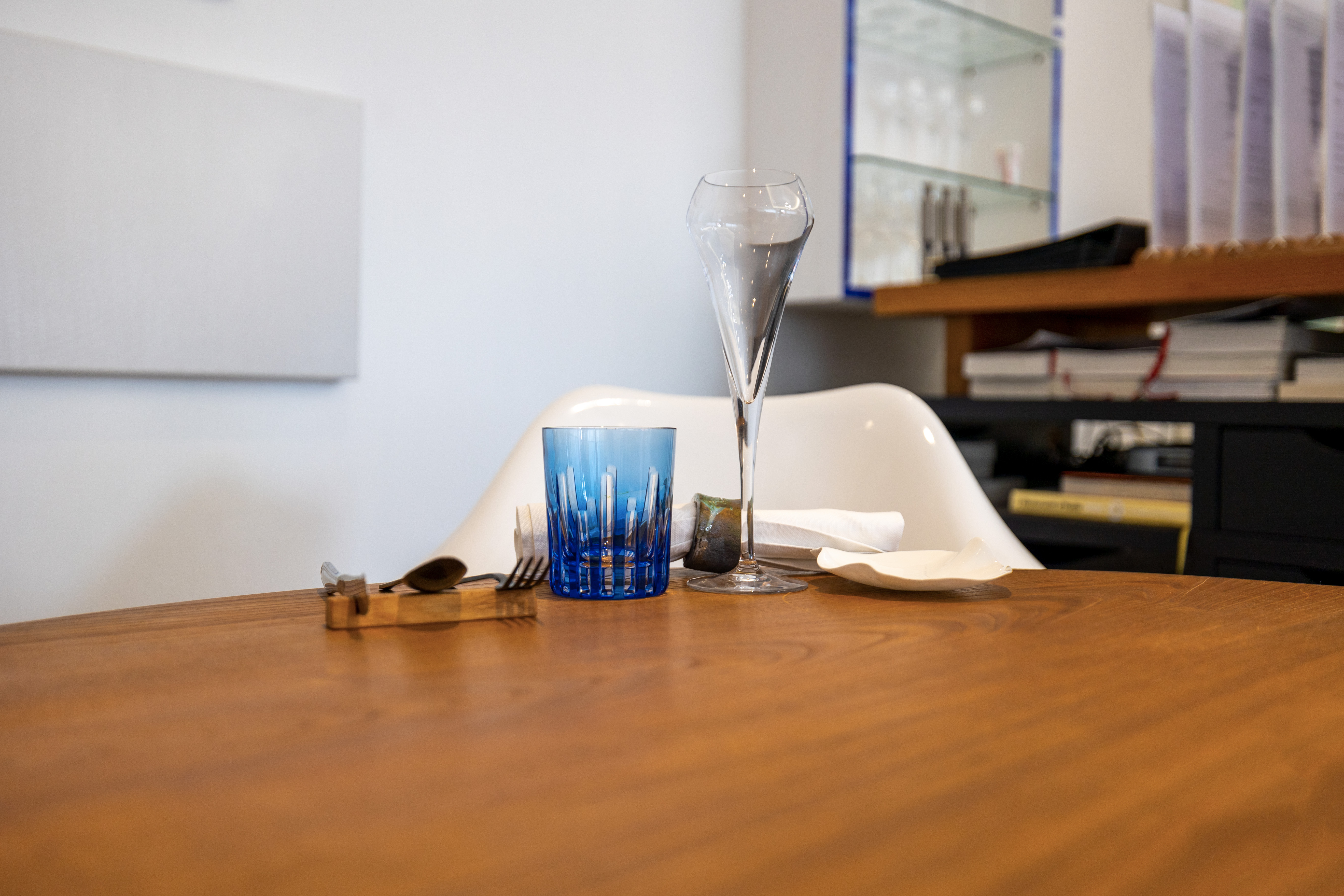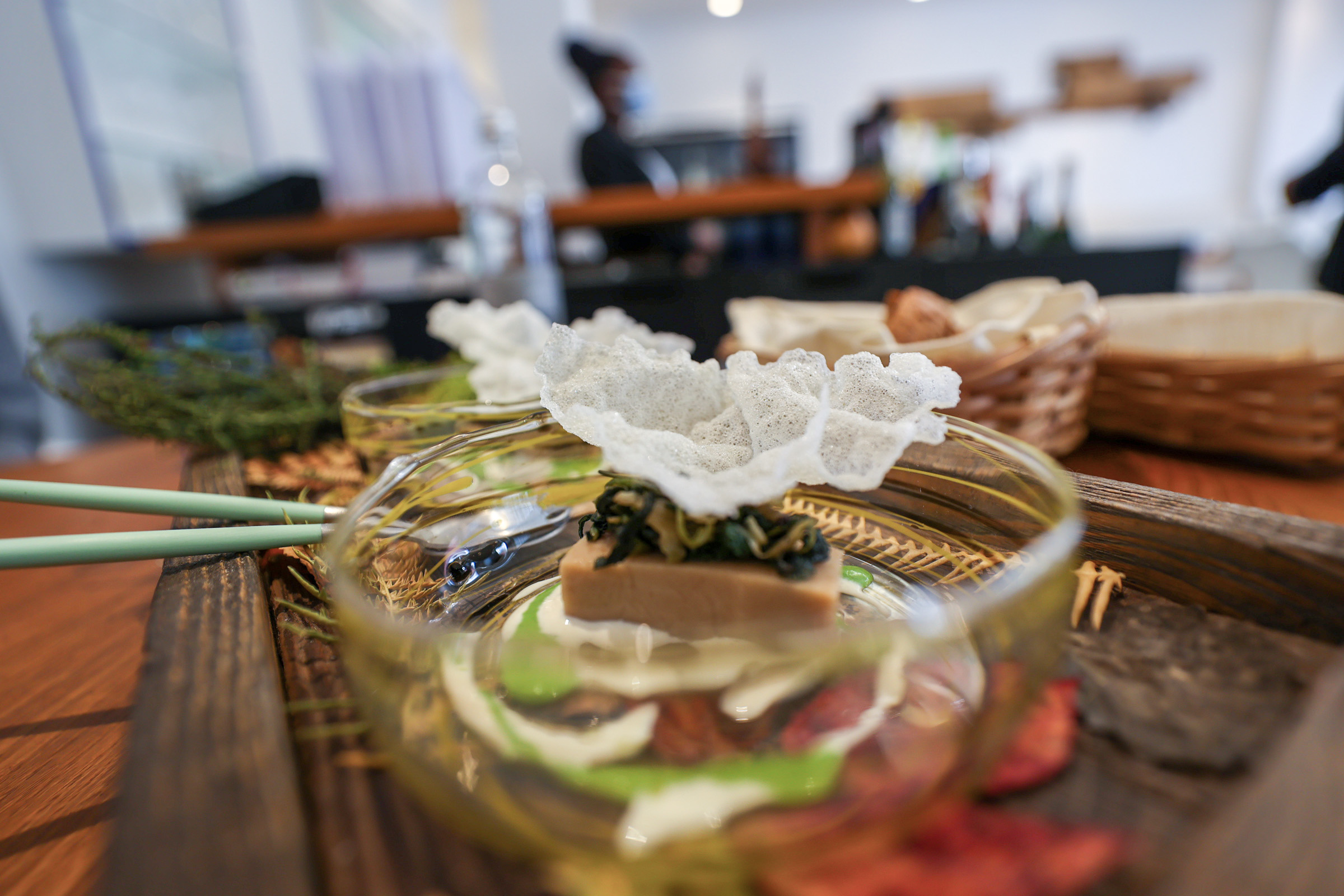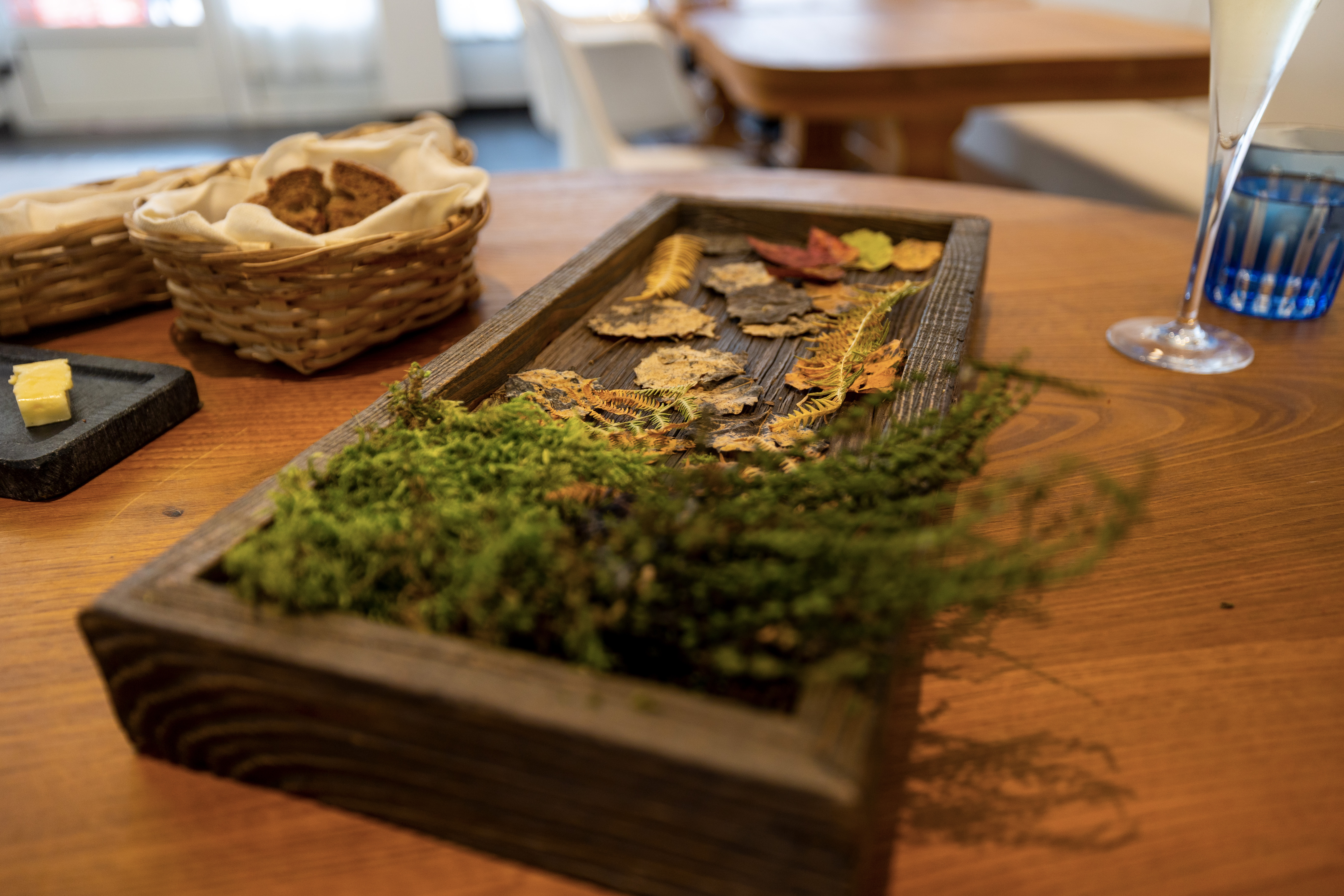 Le pietanze vengono servite al tavolo in piatti, ciotole e bicchierini che da soli sono un’opera d’arte: nelle ceramiche raku sono state catturate le sfumature delle foglie, della terra, dei muschi, nel vetro si intravedono i fiocchi scompigliati dalla bufera di neve.