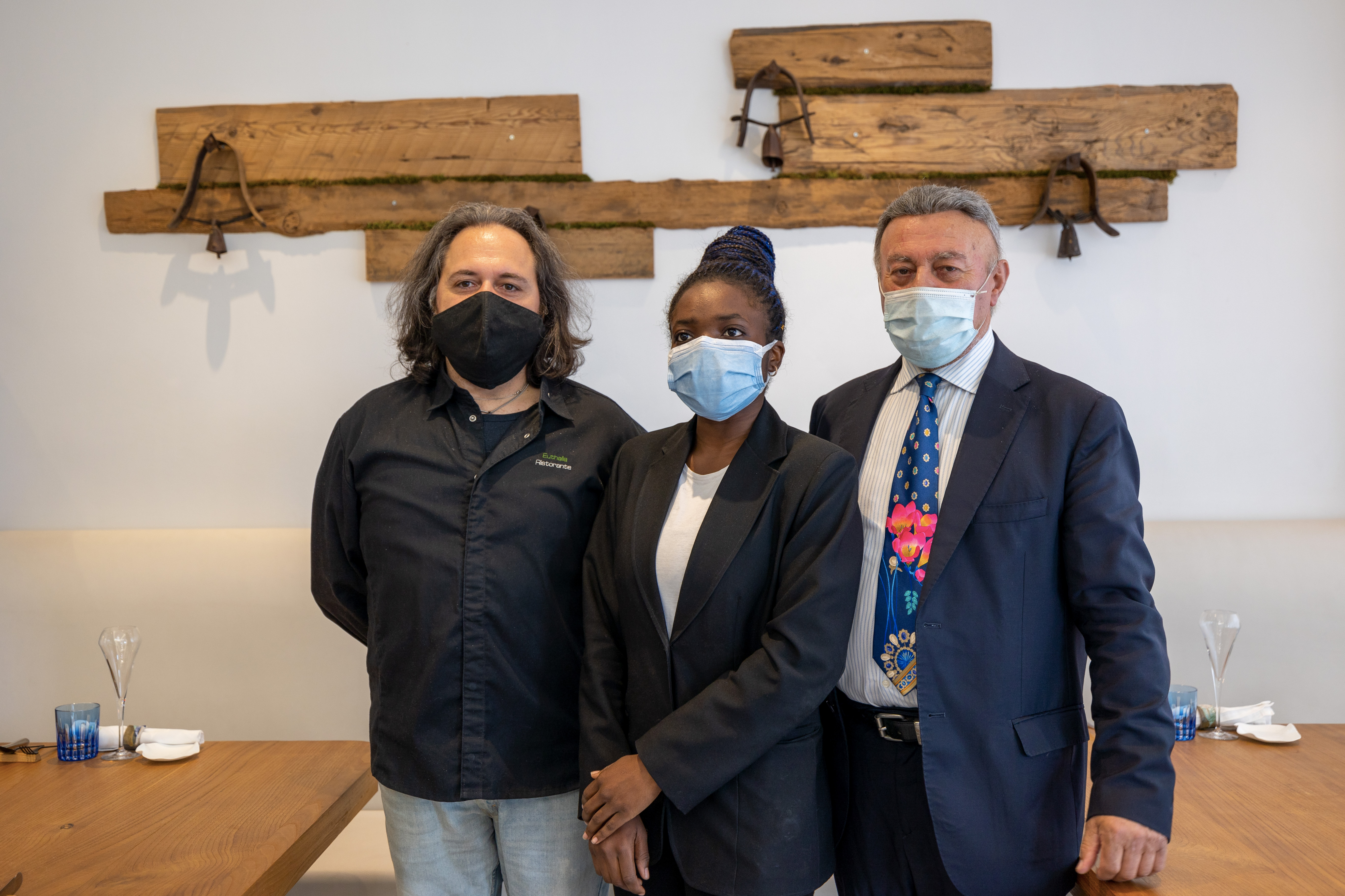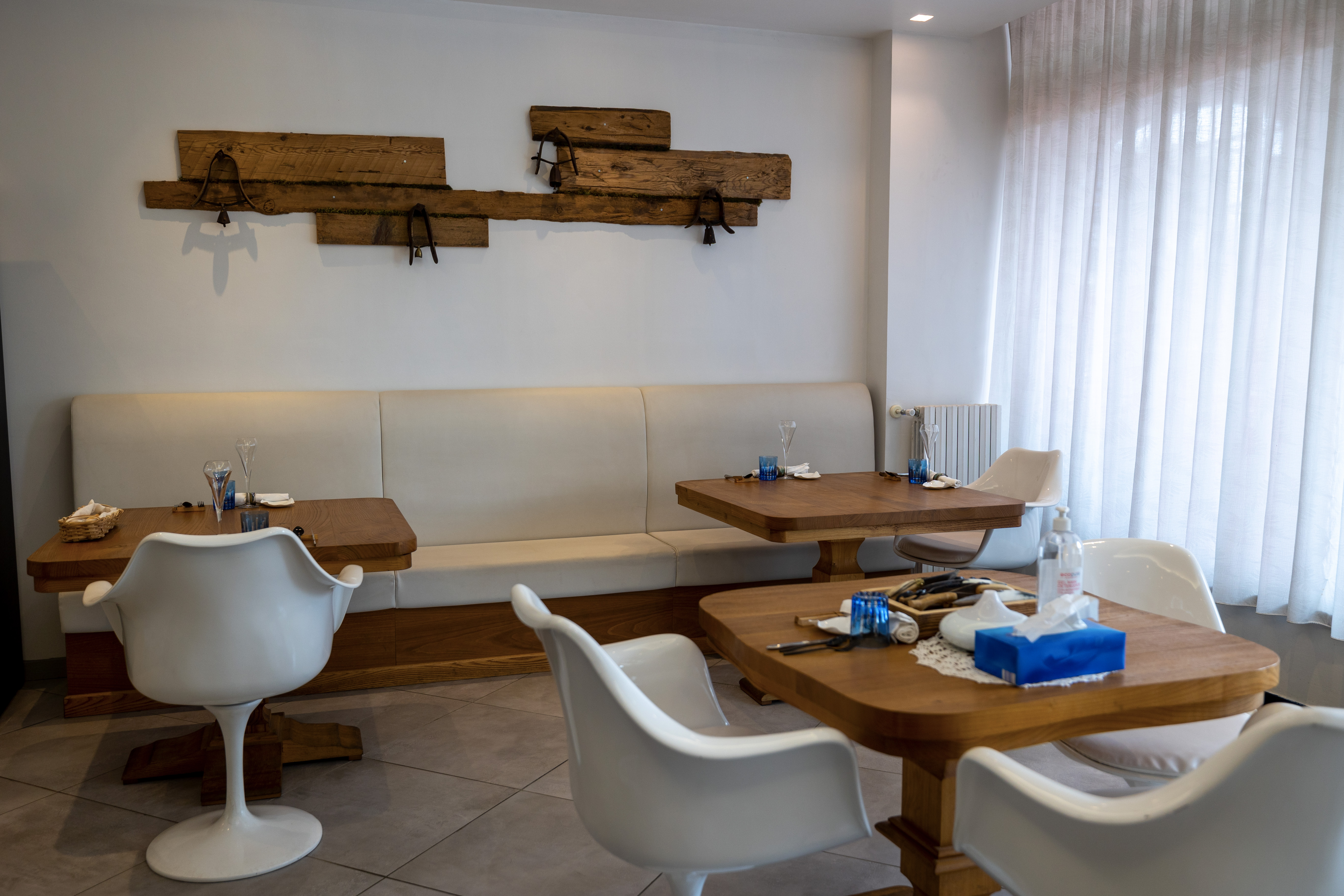 Tutto all’interno del ristorante racconta la montagna: i tavoli in legno di castagno, il marmo nero dei vassoi, il verde del muschio alle pareti, addirittura l’ululato dei lupi come sottofondo sonoro.