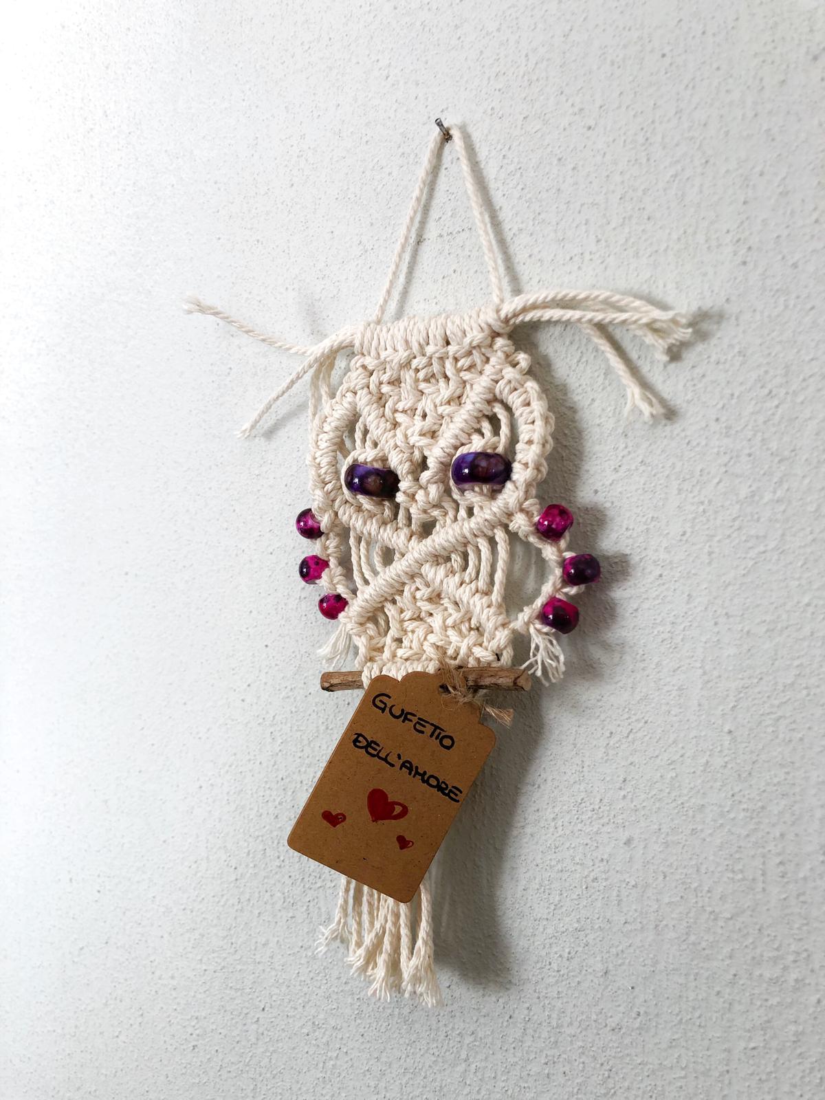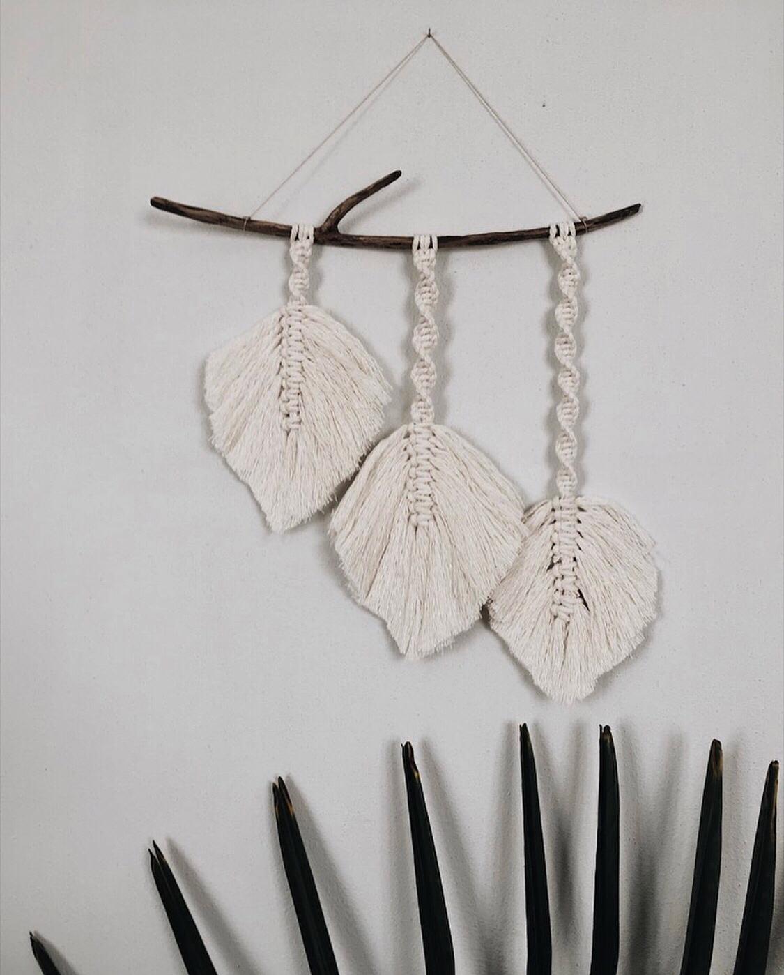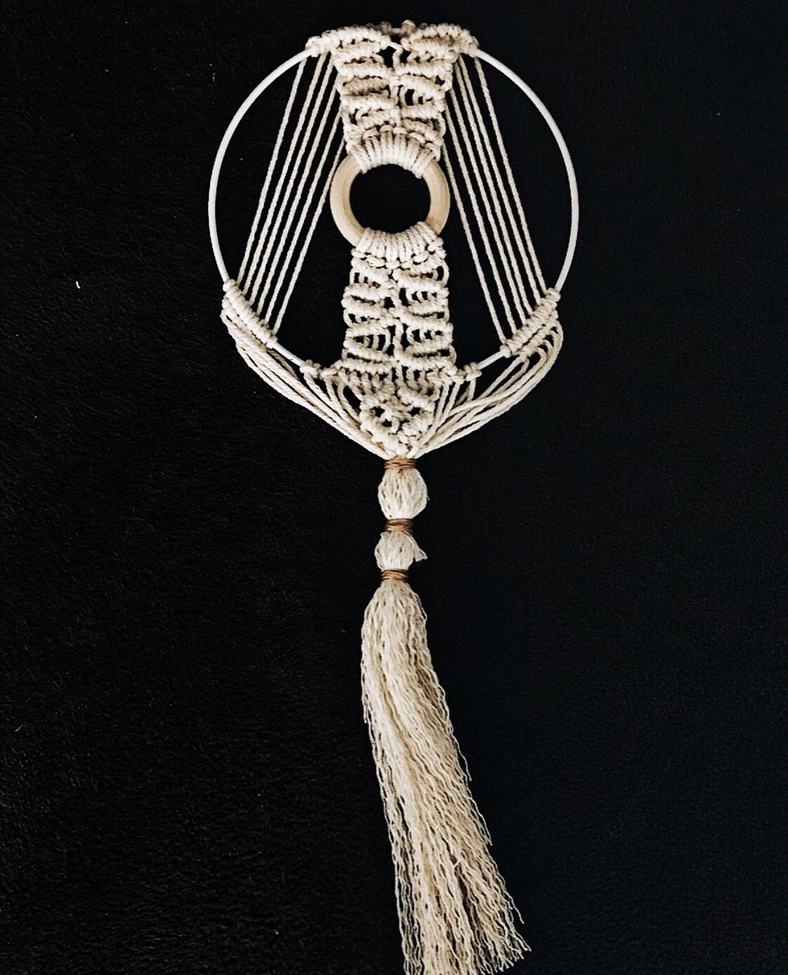 Ogni macramè è prodotto con fili 100% cotone di diverse dimensioni ed è impreziosito con perline dai mille colori, morbide piume o con altri materiali come i rami, che raccoglie personalmente al mare o dal letto del fiume.