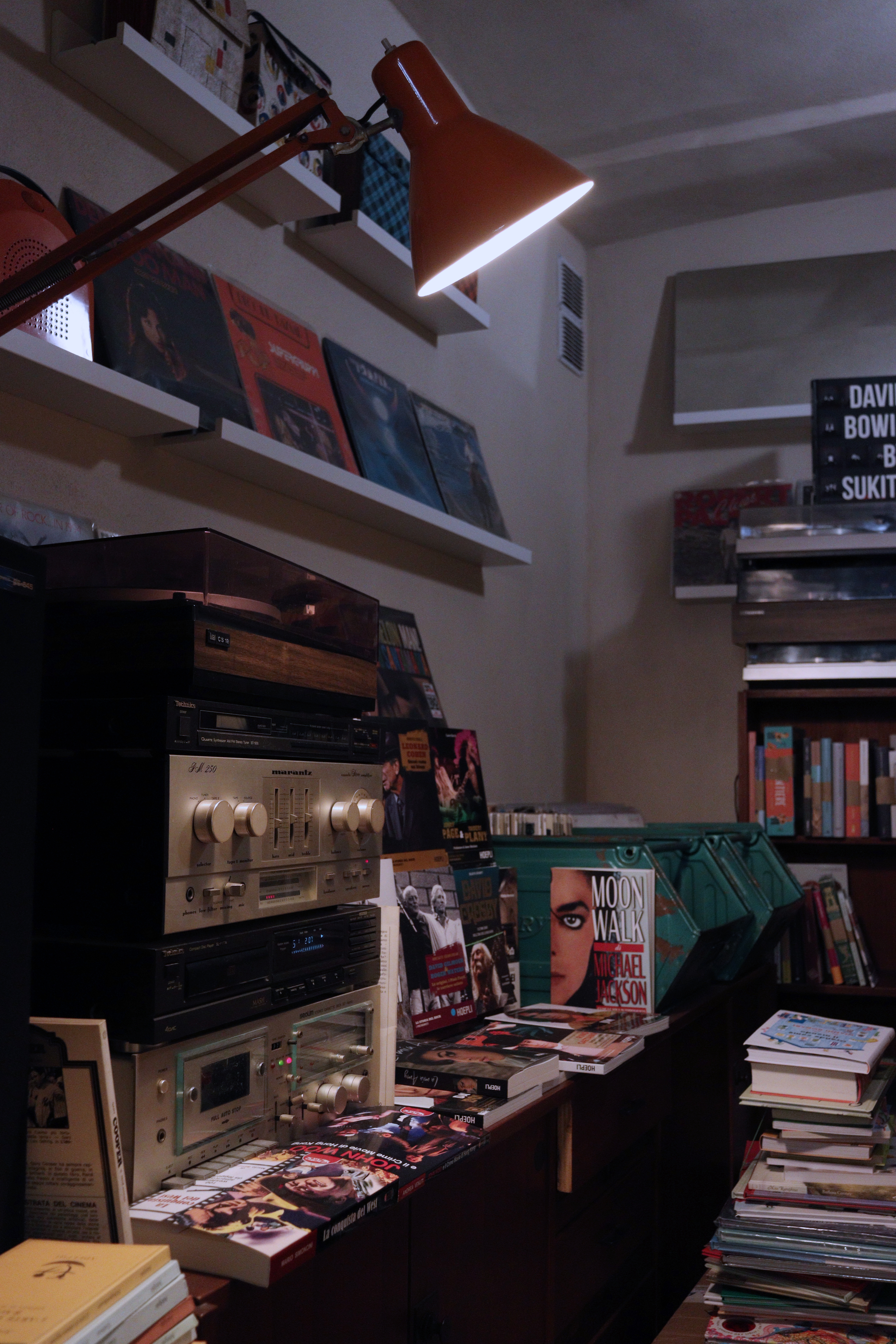 Gli arredi che compongono il suo covo di storie provengono dalla vita di diverse persone e tra questi troviamo: uno scaffale appartenente ad una drogheria di Pinerolo, un lampadario tenuto per tanti anni in una cantina che finalmente ha rivisto la luce (in tutti i sensi), un divisorio trovato nel Centro Antichità Fossano precedentemente utilizzato in una vecchia biblioteca e il tavolo centrale, pezzo portante della sua realtà che arriva da un commerciante di dischi di Saluzzo.