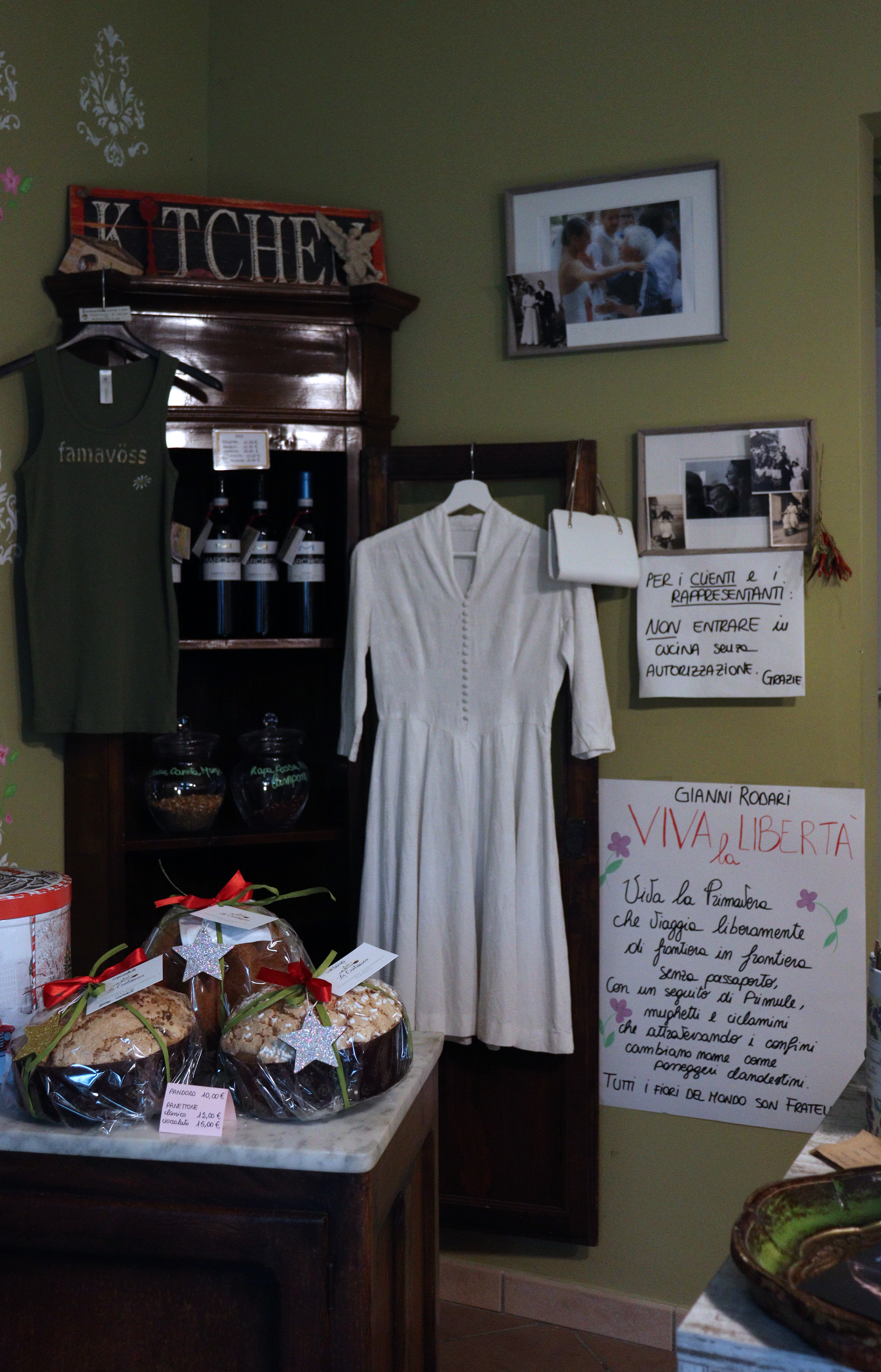 Il negozio le assomiglia molto e rispecchia i suoi principali interessi: una parete verde che lei stessa ha decorato, la vetrina abbellita da fiori colorati, tre lavagnette scritte a mano, un tavolino con il suo libro (sì, è anche una scrittrice!). Tutto profuma di ricordi. Un abito bianco appeso ad un’anta di un mobile antico attira subito la nostra attenzione. È il vestito da sposa di nonna Dina, la prima persona che ha sempre creduto in lei, ci spiega Federica.