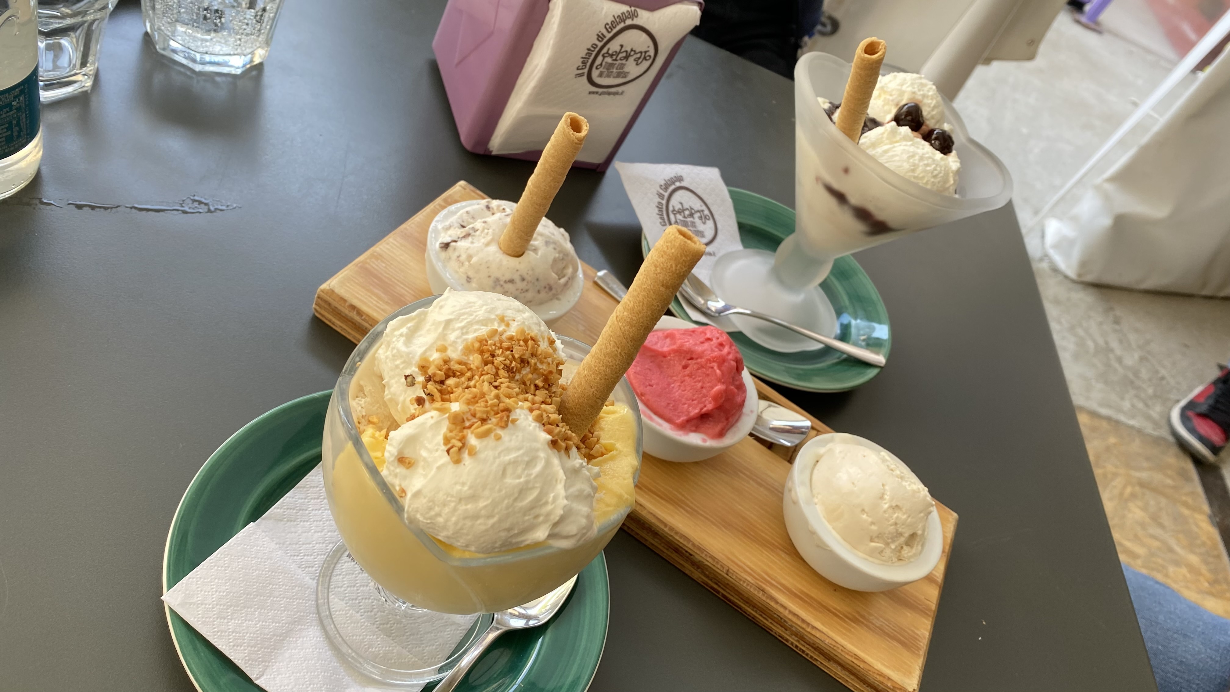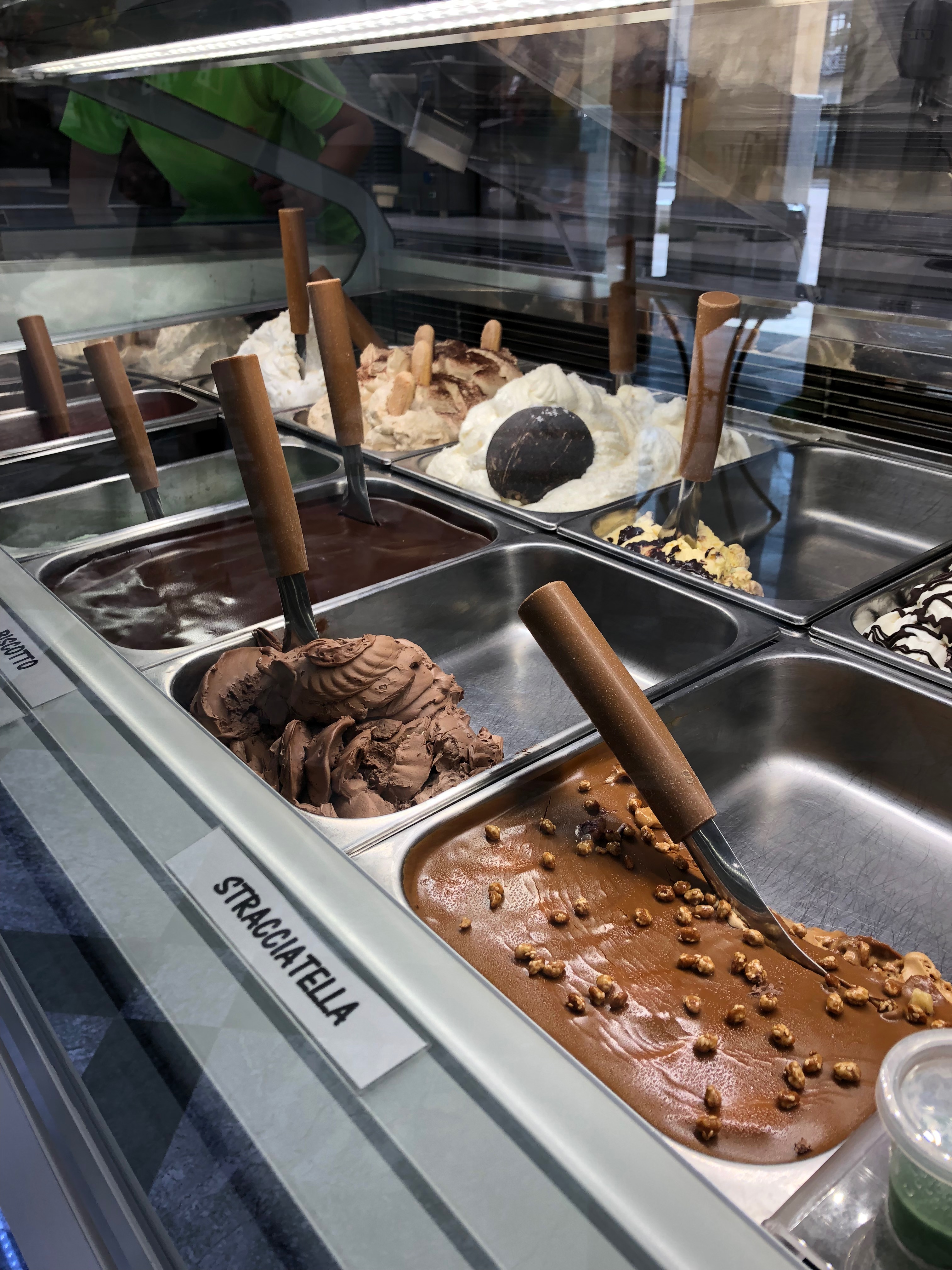 Il locale è ampio, presenta una saletta interna, un grande bancone dove poter scegliere tra gli innumerevoli prodotti e un paio di tavolini all’esterno. Qui fa da padrone il gelato, realizzato con ricette della tradizione che valorizzano la materia prima, da gustare nelle numerose coppe gelato proposte.