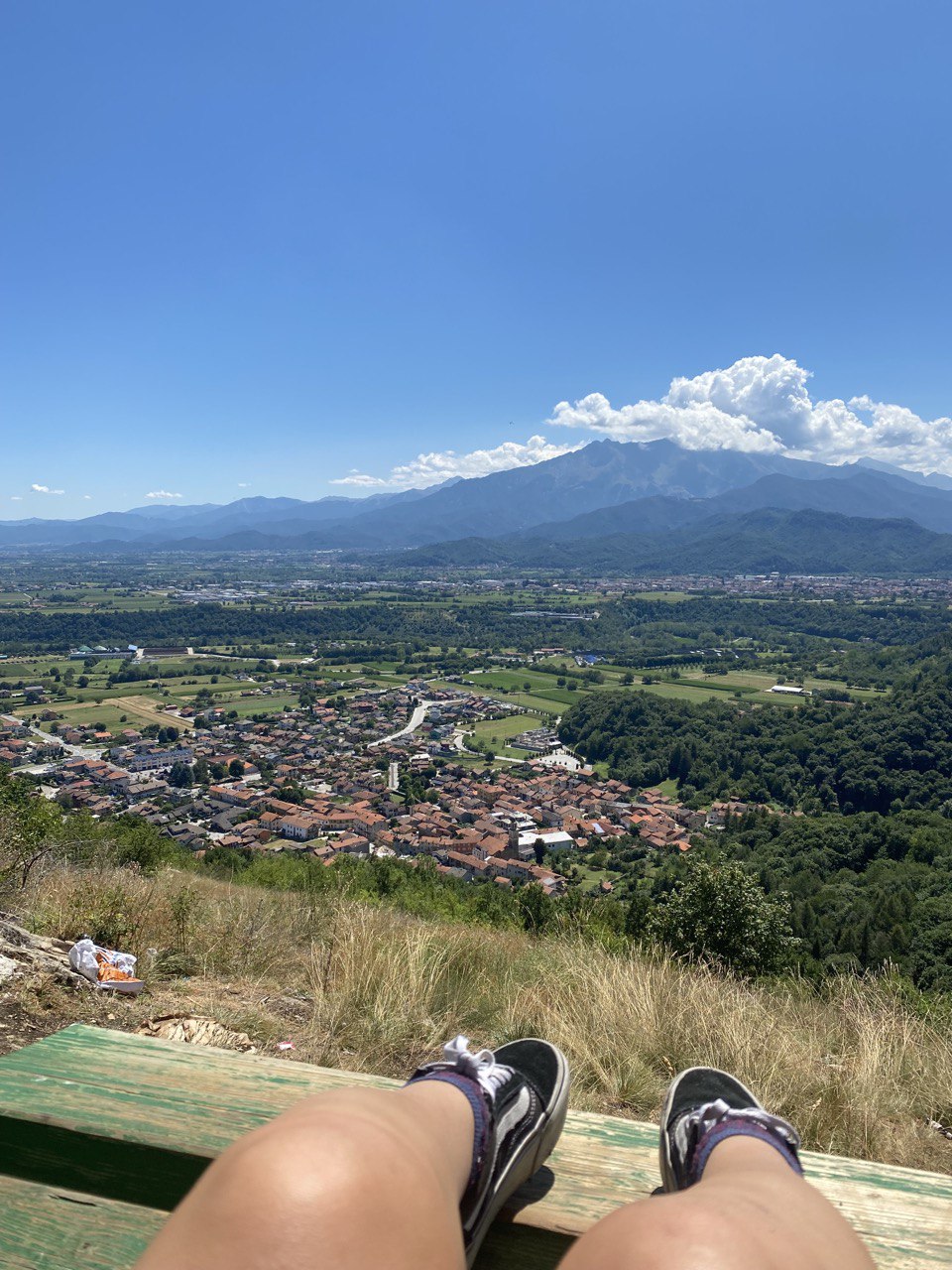La panchina si trova in piazza Belvedere, da cui si gode un’ottima vista sul panorama del borgo, circondato dall’Arco Alpino.