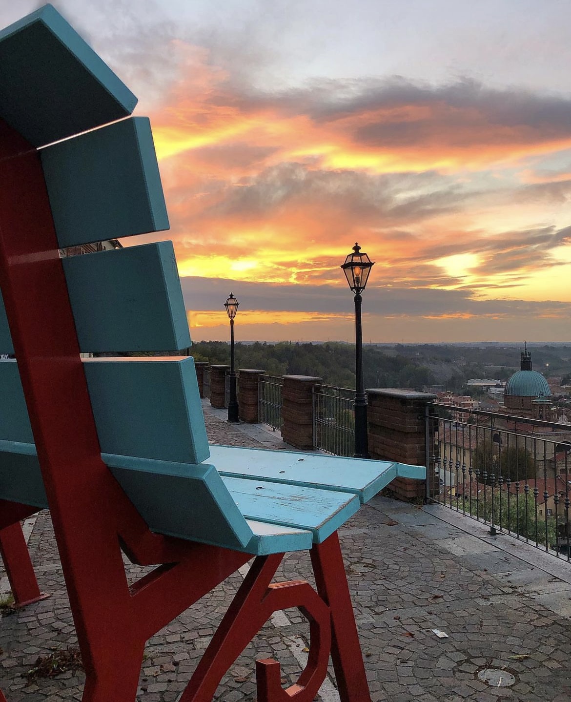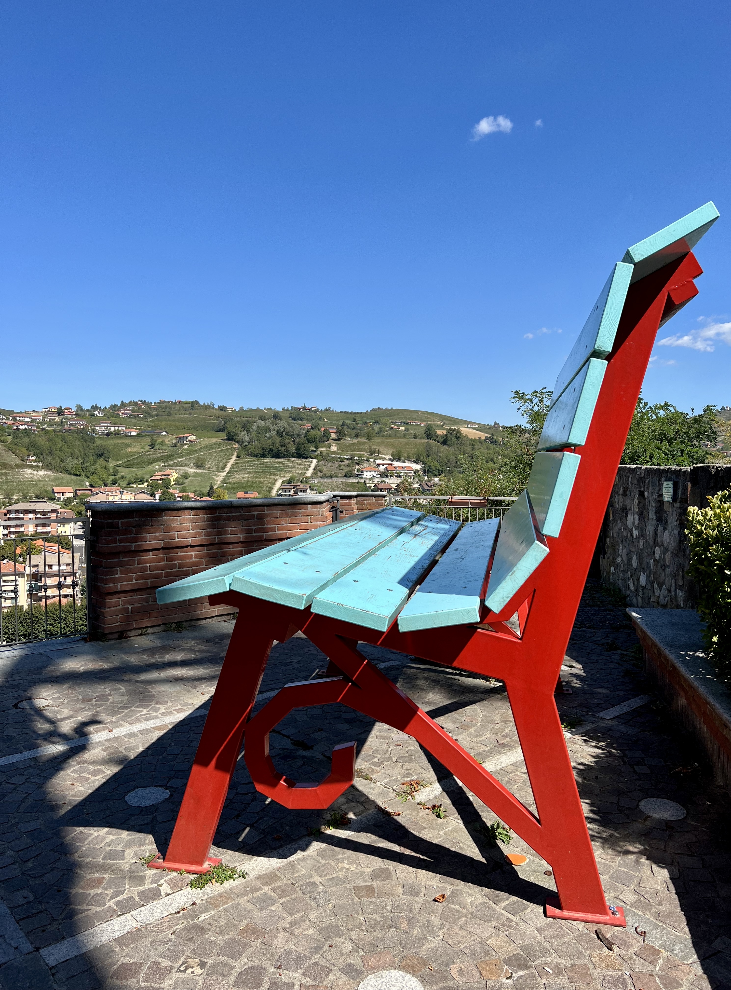 L’azzurro e il rosso mattone sono le tinte che caratterizzano la Big bench n°13, le stesse che colorano la deliziosa cittadina di Dogliani che la ospita nel cuore del suo centro Storico.