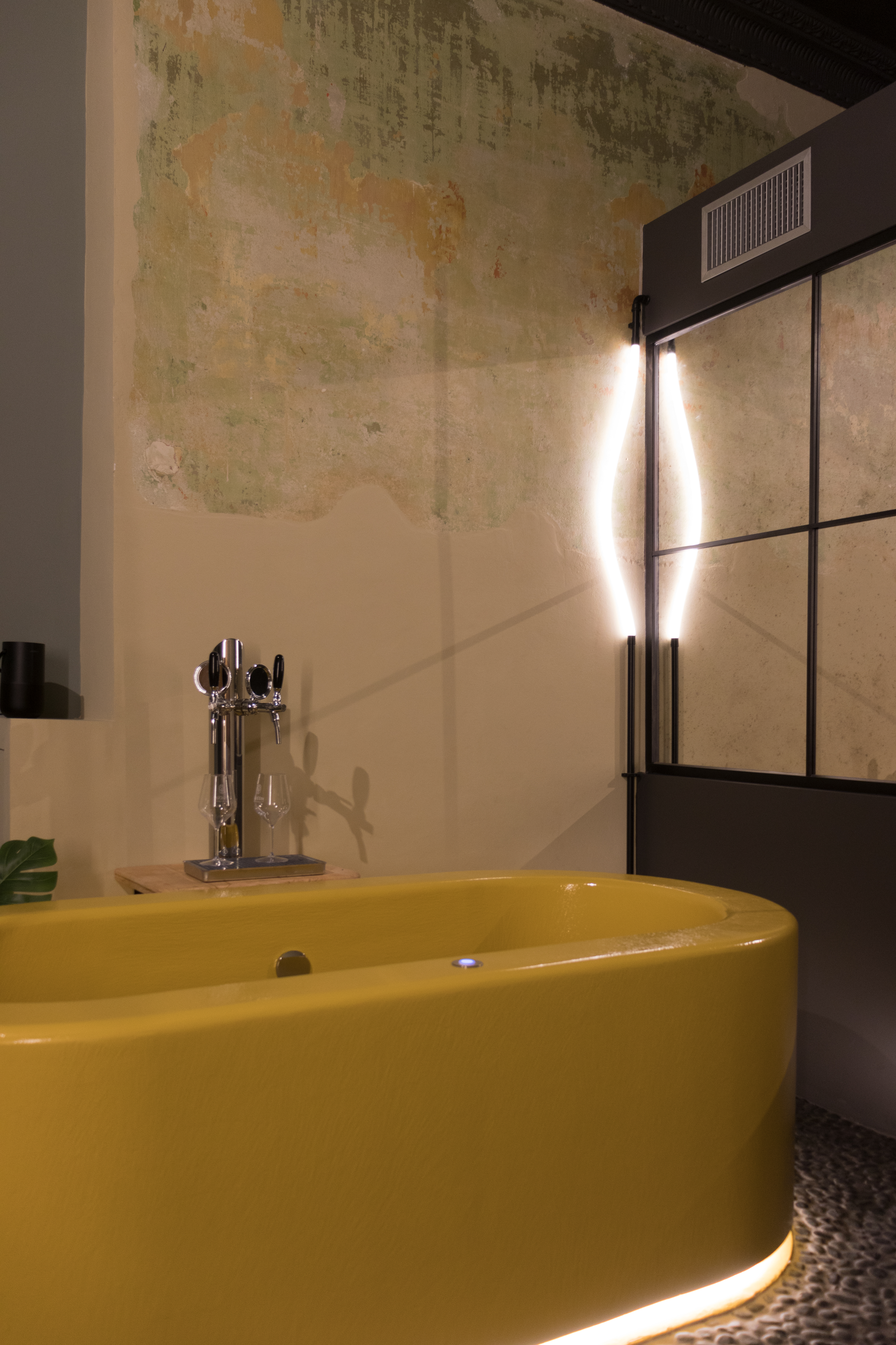 Giallo come la birra, grigio come lo stile industrial vuole e caldo come la temperatura di luce giusta che serve per rilassarsi.