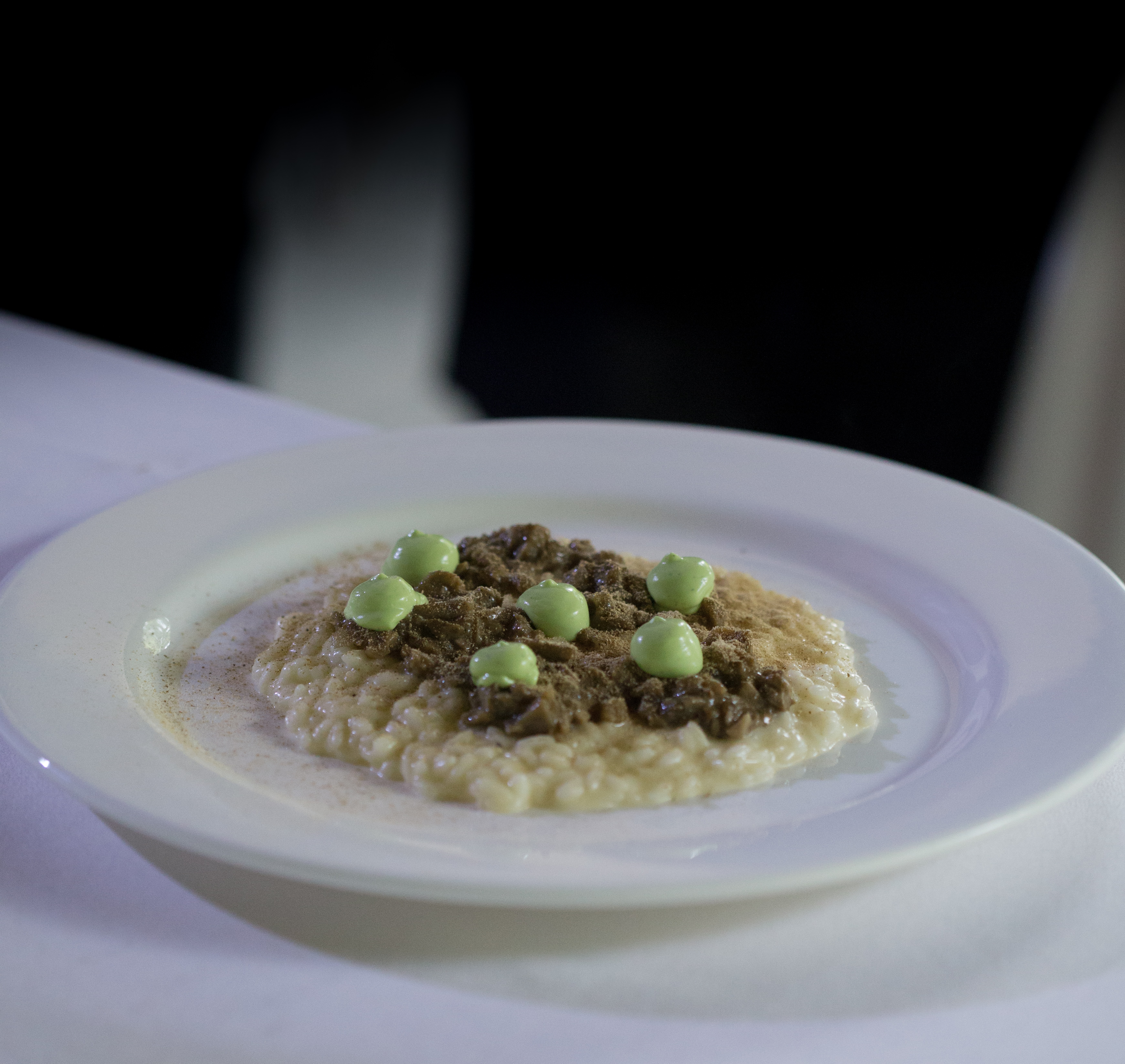 La prima portata è stata un cremosissimo risotto mantecato con tumin del mel, ragù di funghi porcini, polvere di funghi porcini secchi e un’emulsione di prezzemolo e aneto. Il riso utilizzato proviene da Riso Buono risiera di Casalbeltrame (No), tra le più buone della zona, che si sta adattando al cambiamento climatico facendo una coltura a secco.