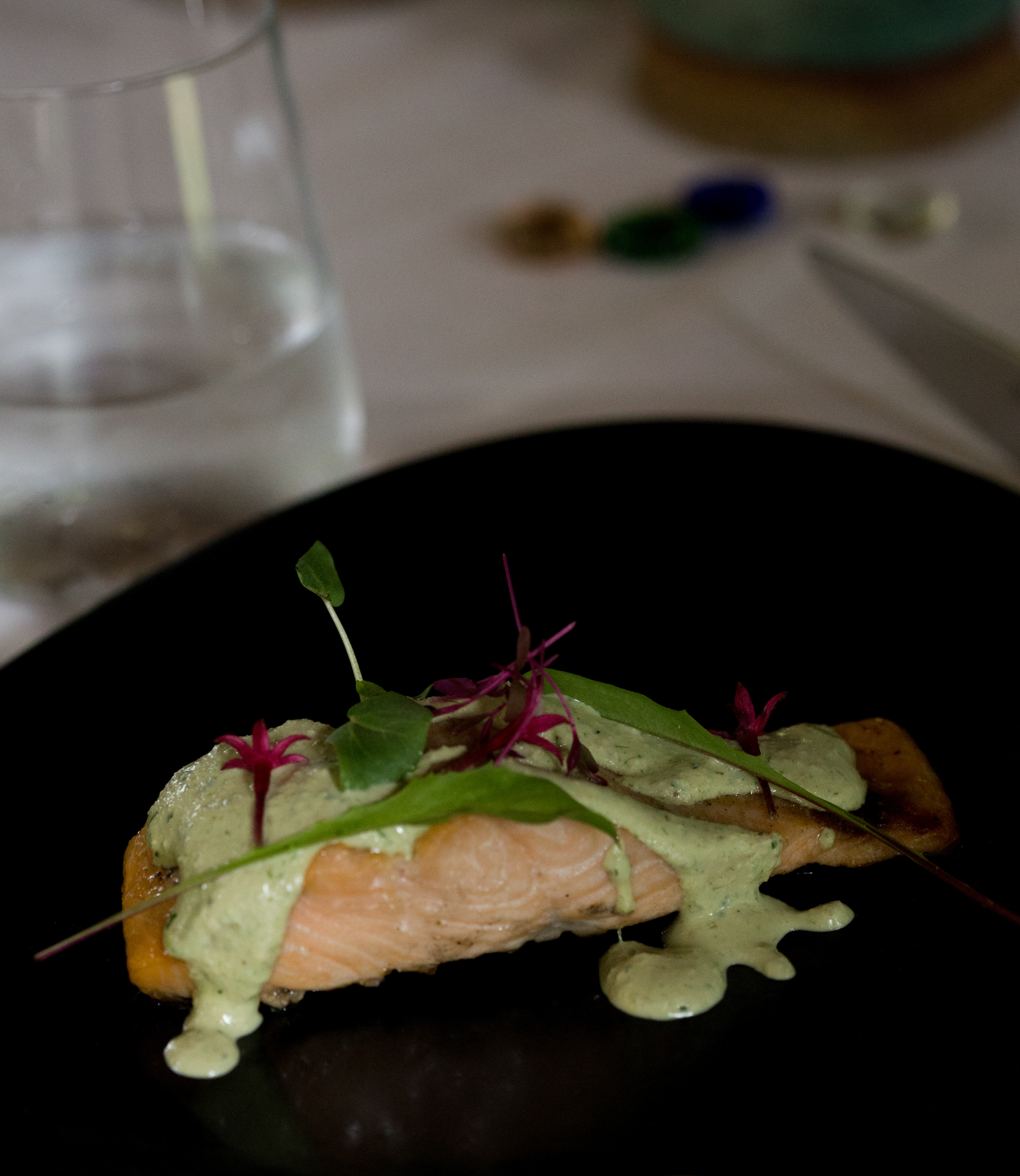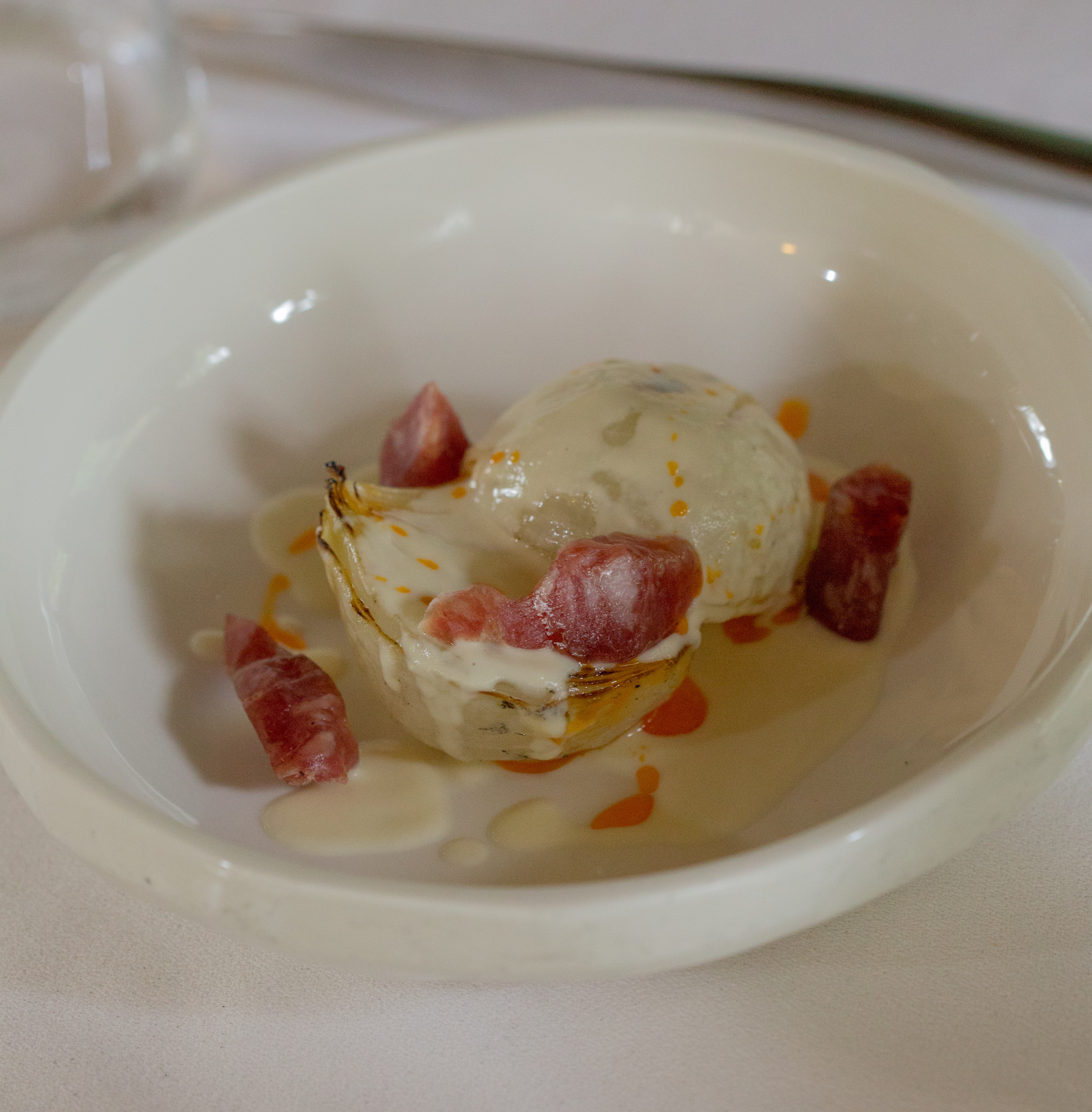 Vengono serviti due antipasti locali, la cipolla bianca del loro orto cotta alla brace, servita su una fonduta di tometta campagnola, proseguendo con un filetto di trota di Agritrutta, allevamento ittico di San Biagio (CN) con Aioli, Pesto di Noci ed una salsa alle erbe.