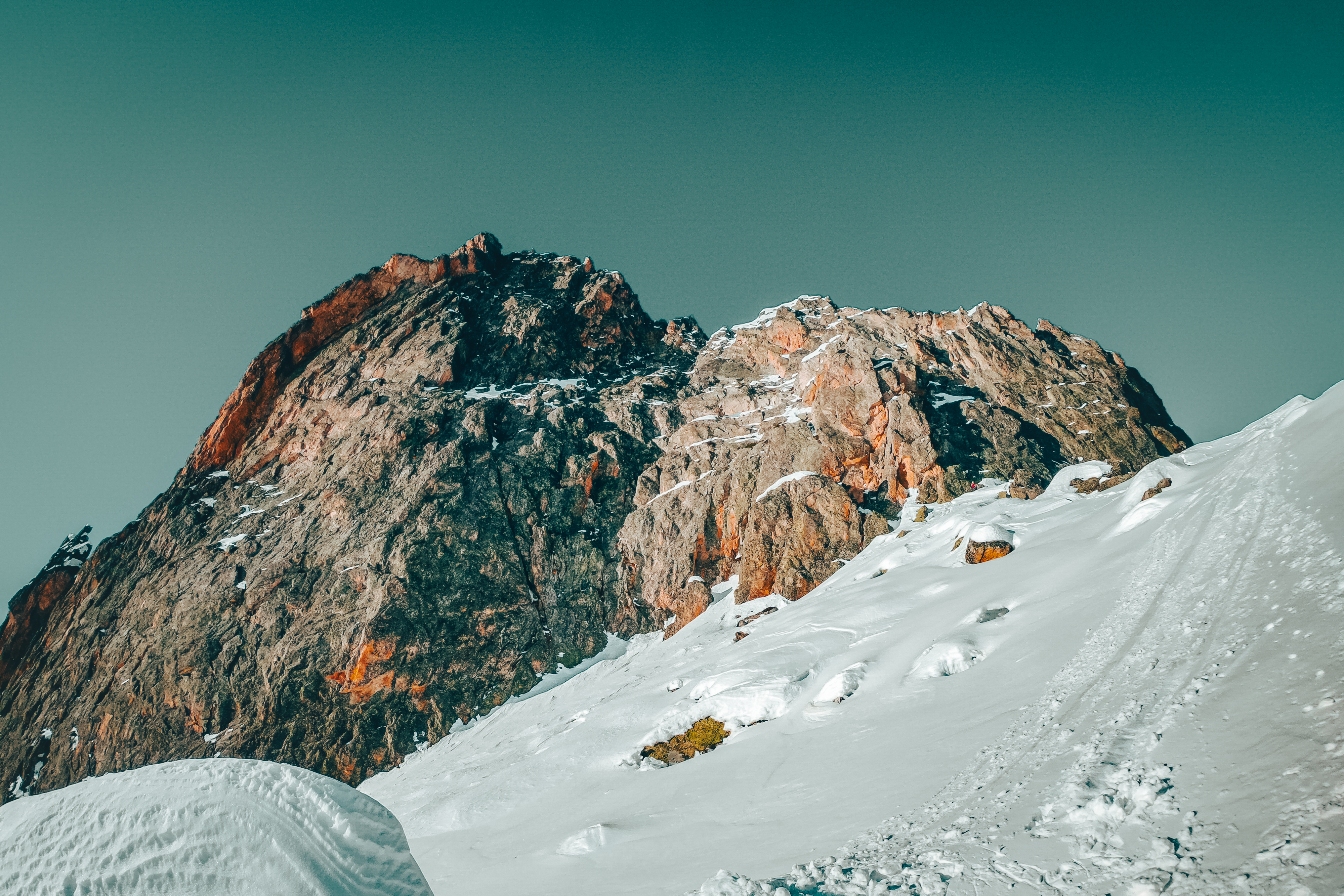 La roccia è quasi del tutto sgombra da neve, ma l’idea di arrampicare a mani nude non mi sfiora affatto, per il momento. Lo raggiungo e passo davanti, tocca a me il traverso sulla cengia appena al di là di un breve camino: intasata di farina inconsistente non è molto invitante, ma per il momento i ramponi possono continuare a giacere sul fondo dello zaino. Prendo invece la piccozza sul retro e mi avvio, a tentoni, lungo quei 50/60 metri che mi separano dalla seconda sosta della via. Nel mezzo mi proteggo rinviando le corde in uno spit che sbuca dalla neve: pare un diamante investito dagli ultimi raggi di sole. Un passo oltre e vengo inghiottito dall’ombra, che non ci abbandonerà più fino a quando non sbucheremo in cima. Recupero il socio, scambiamo due parole, da qui si vede meglio la parte alta della Sigismondi. Un paio di tiri di corda ci separano dal breve camino che ci porta in cresta. Il terreno si impenna, la neve aumenta.