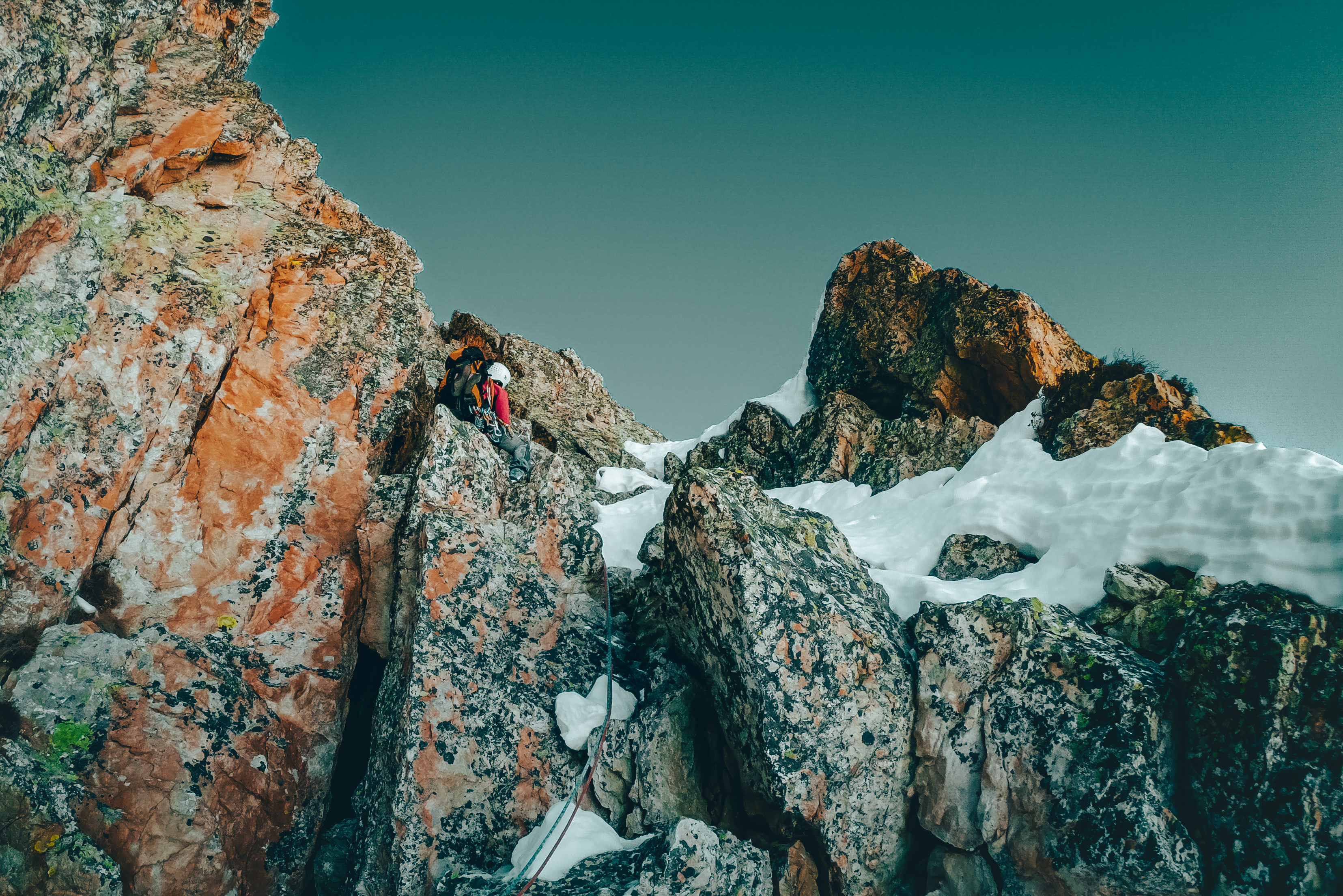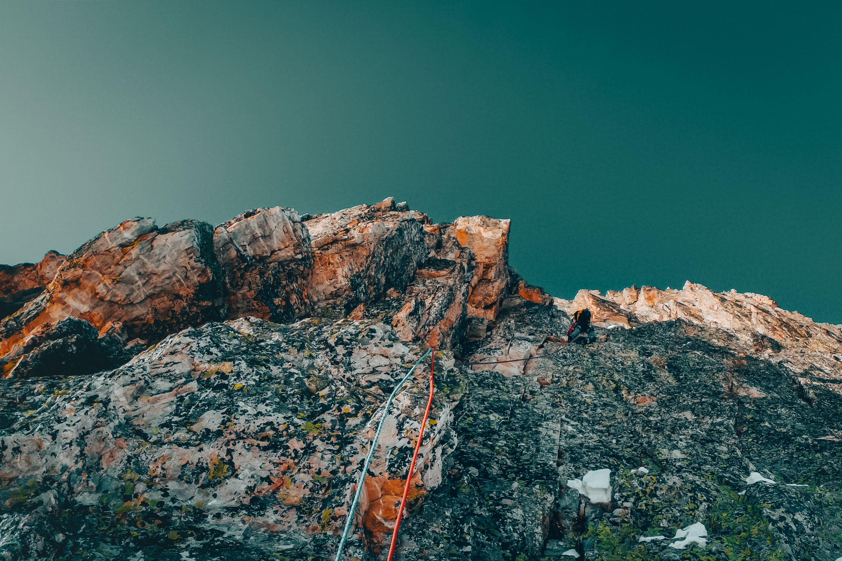 Luca mi fa un cenno, ha indossato le scarpette e riparte in direzione del camino, appena una decina di metri sopra le nostre teste. Supera alcune rocce rotte, ammassate e incastrate l’una sull’altra, più in alto piega leggermente a sinistra ed esce nuovamente in sosta. Mi recupera, salgo a mia volta e riparto per il primo tiro in cresta. Il sole non riesce ancora a raggiungermi, rimango nell’ombra ma ormai ne sento già l’odore.