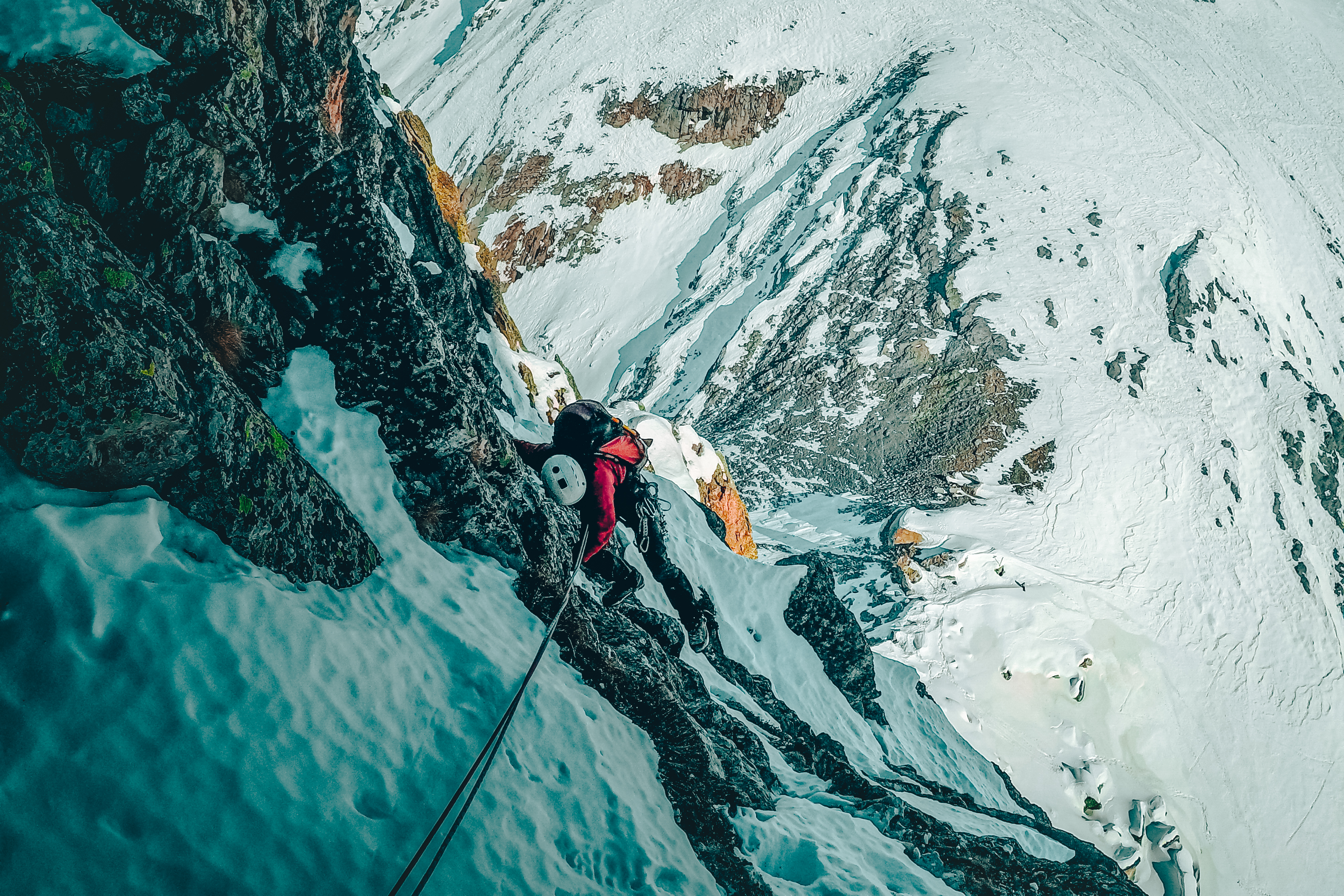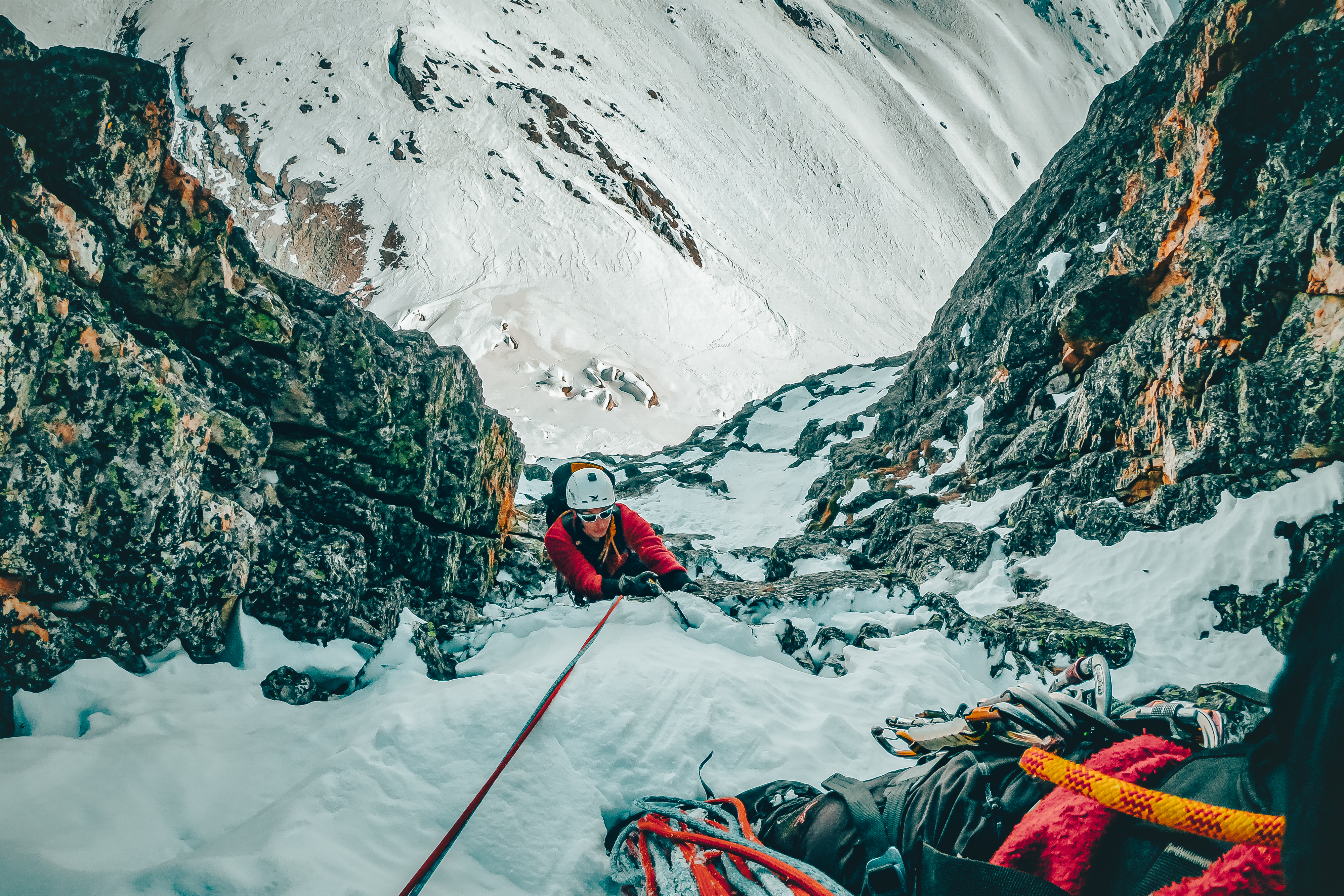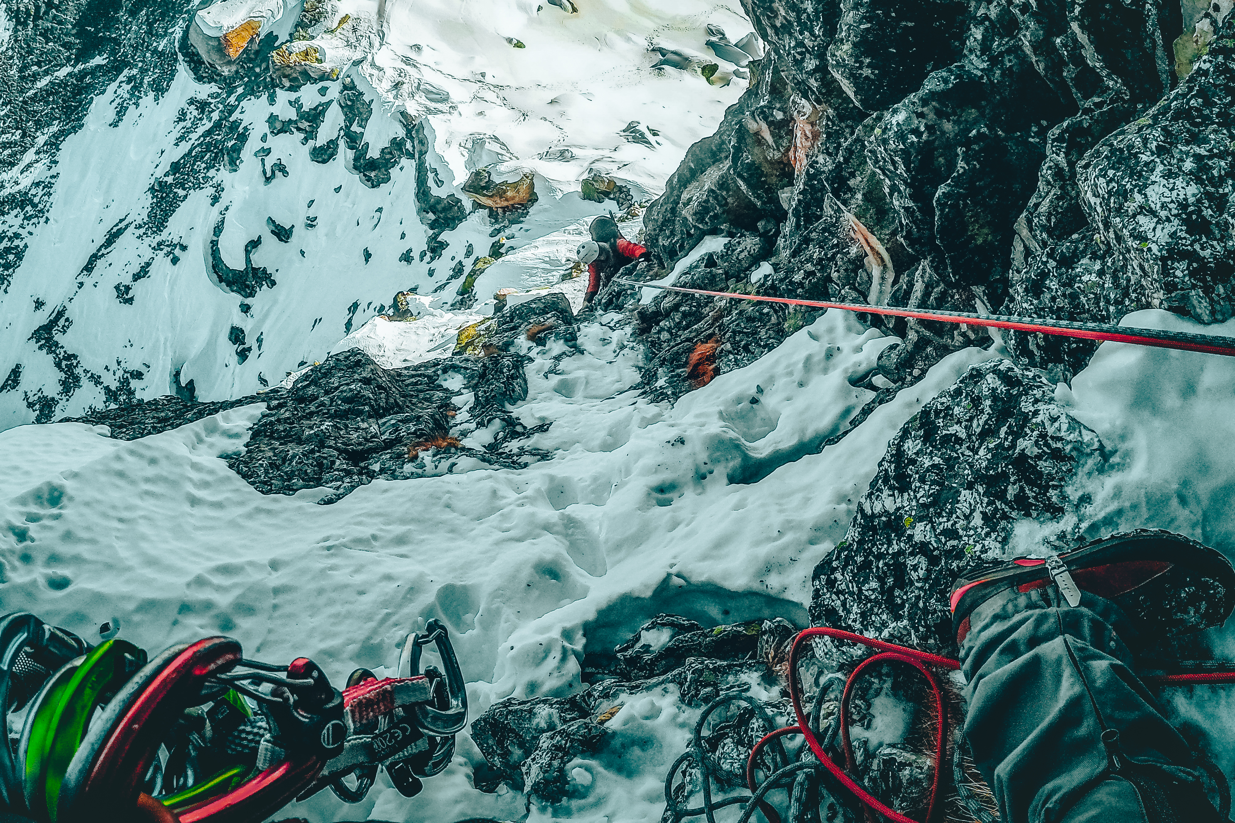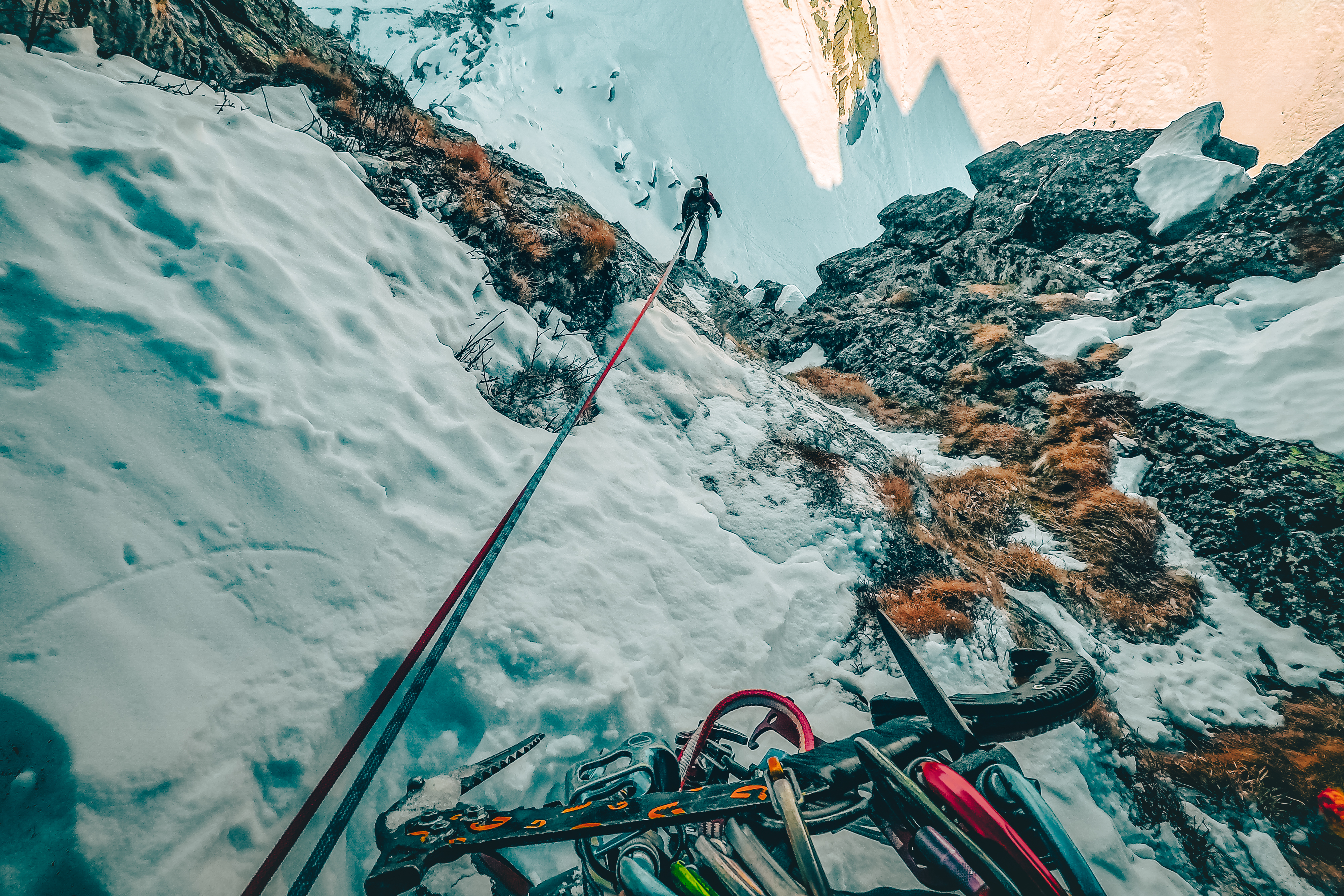 Luca parte per primo. C’è calma di vento, il tintinnio della ferraglia sul suo imbrago riecheggia sbattendo sulla prima breve paretina che lo vede avvicinarsi, per poi perdersi immediatamente alle mie spalle, sui pendii prativi imbiancati. Io intanto rimugino sulle tempistiche: con mille variabili in gioco e l’imprevisto dietro l’angolo non è mai facile prevedere l’arrivo in cima e il rientro a valle. Ma pur dovendo ammettere di essere un ritardatario cronico nella vita di tutti i giorni, in montagna, per qualche motivo, potrei far concorrenza a un orologio svizzero.