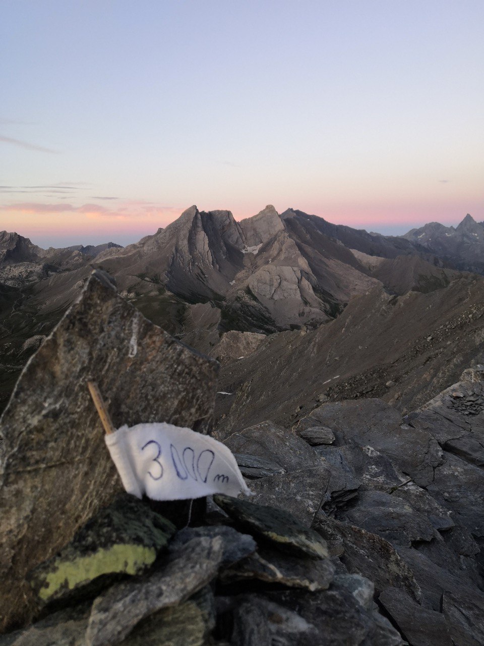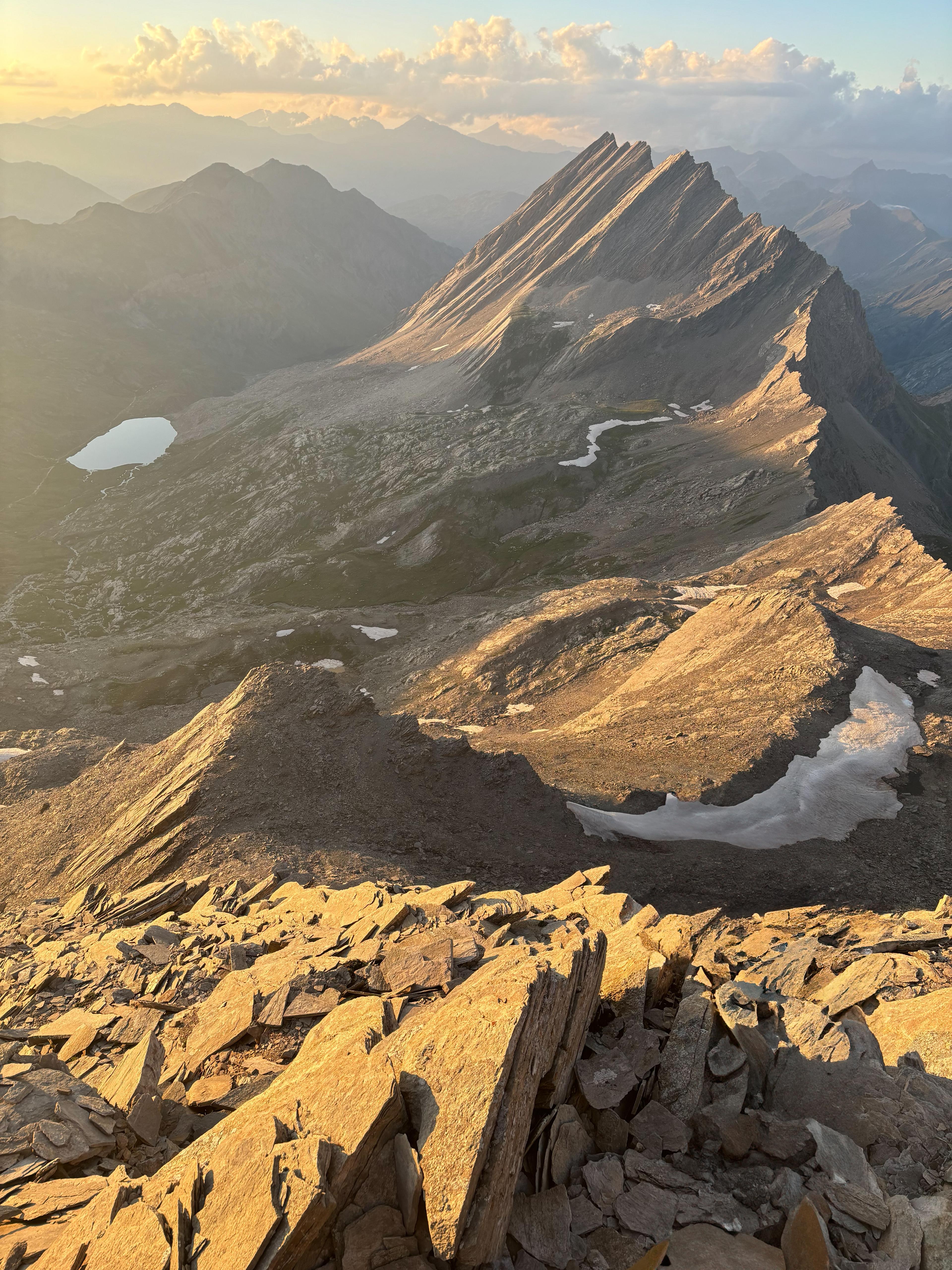 Ci godiamo il tramonto in vetta, tra riflessi dorati e l’aria sottile della sera.