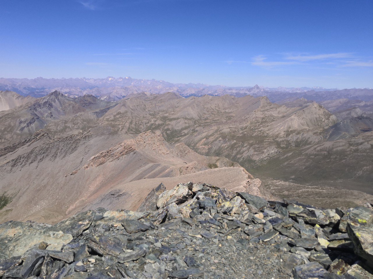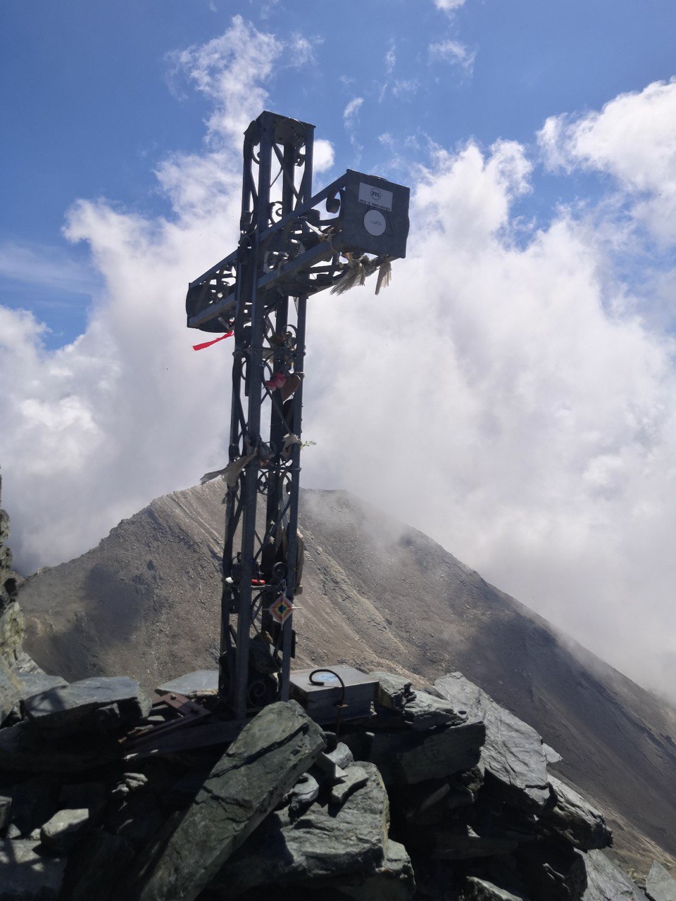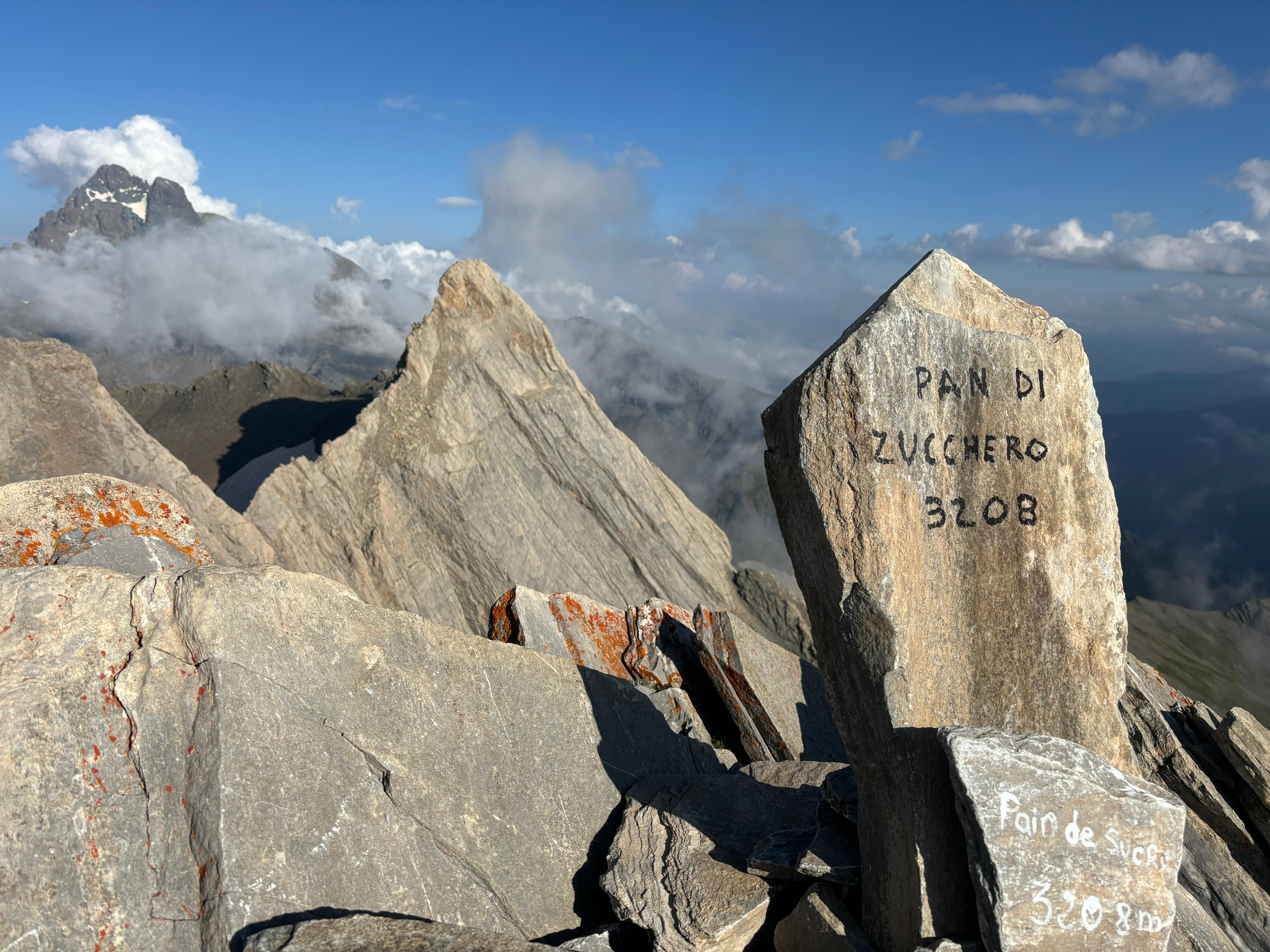 Proseguendo, poco più avanti si staglia dinnanzi a noi la maestosa Cret de la Taillante, con la sua linea inconfondibile, austera ed affascinante. Giunti al Col Vieux la pendenza si fa subito più marcata: il dislivello incalza e il sentiero diventa un pendio detritico. Si raggiunge quindi la vetta del Pan di Zucchero (3.208m) che ripaga la fatica: il panorama è tale da lasciare senza parole. Intorno a noi, con un mare di nuvole che sembrano danzare allargandosi e quindi diradandosi, si ergono le punte della Rocca Rossa, del Pic d’Asti e la frastagliata cresta della Taillante con ai piedi il Lac Foréant. Anche il Re di Pietra si fa ammirare bene da quassù. Ad un certo punto mi fa visita anche lo spettro di Brocken, che appare e scompare tra le nebbie del controluce, come un piccolo incanto montano che solo chi conosce bene la montagna può davvero cogliere e apprezzare.